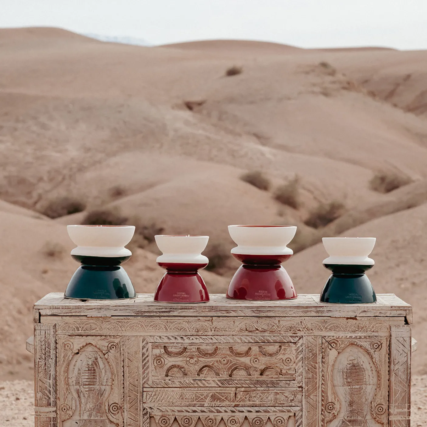 Entièrement faites à la main par des artisans potiers marocains, ces bougies, en céramique émaillée et cire naturelle, embaument les espaces de leur senteur narguilé boisé.