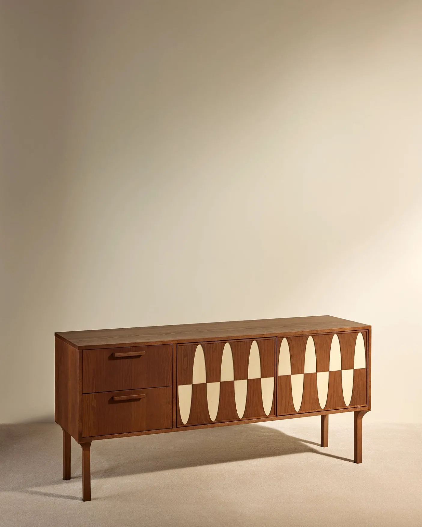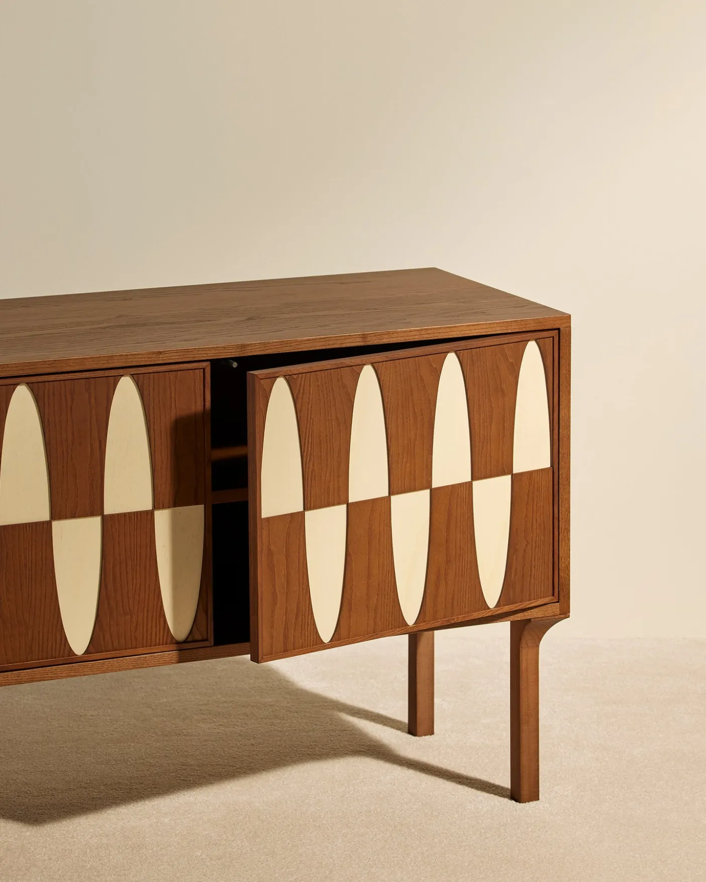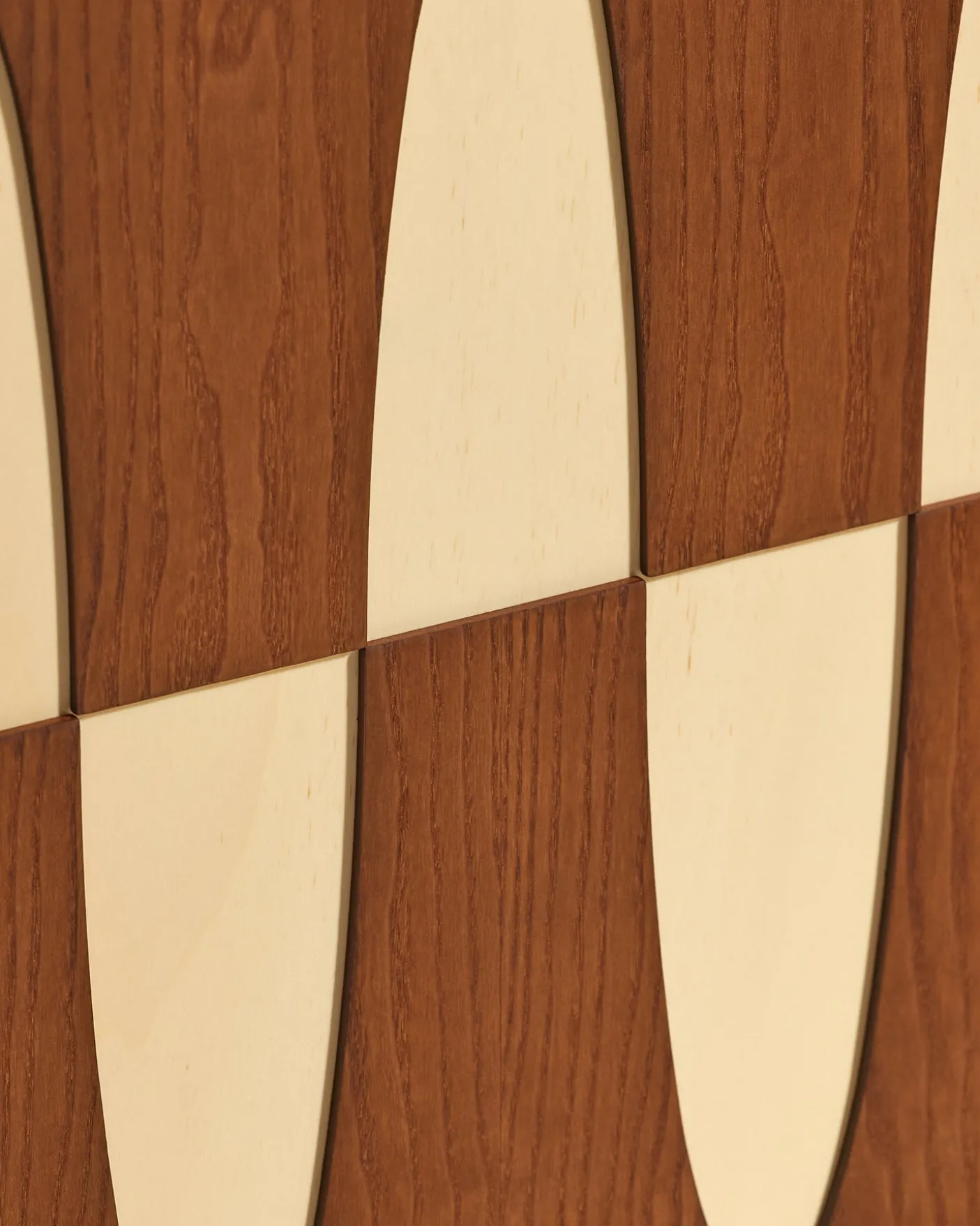 Fabriquée dans un atelier espagnol, l’enfilade Écailles présente deux teintes de bois et une finition noyer.