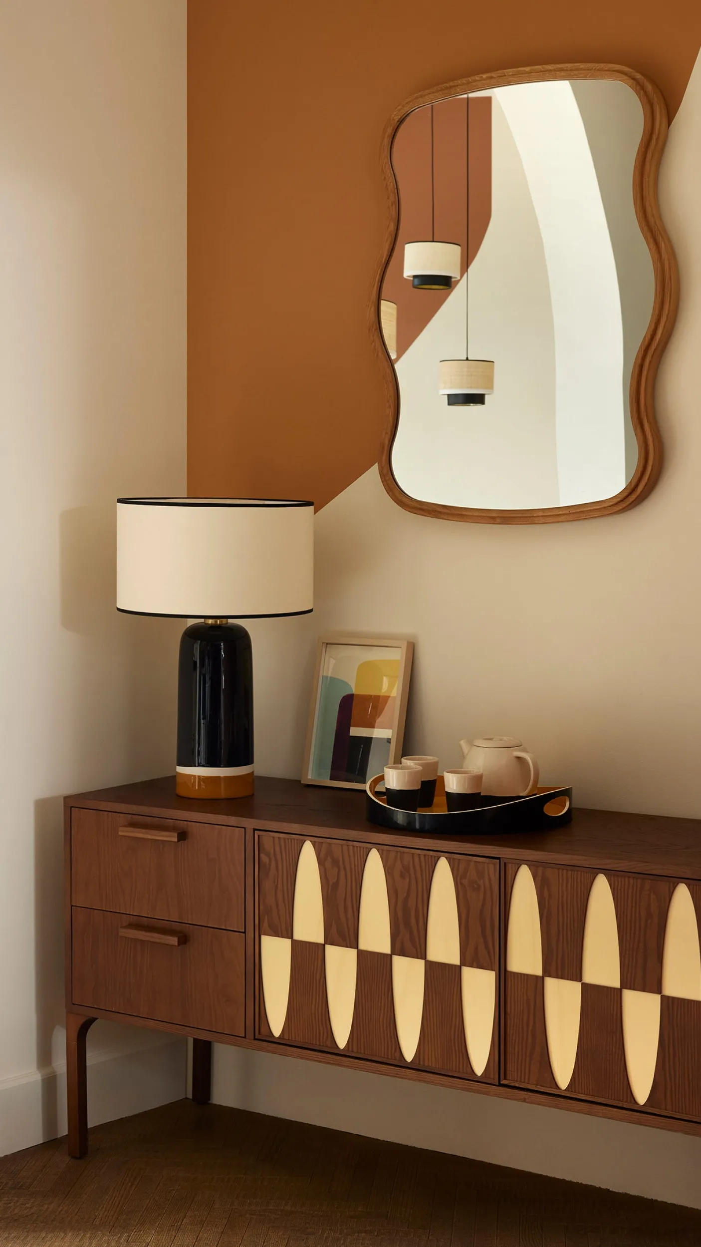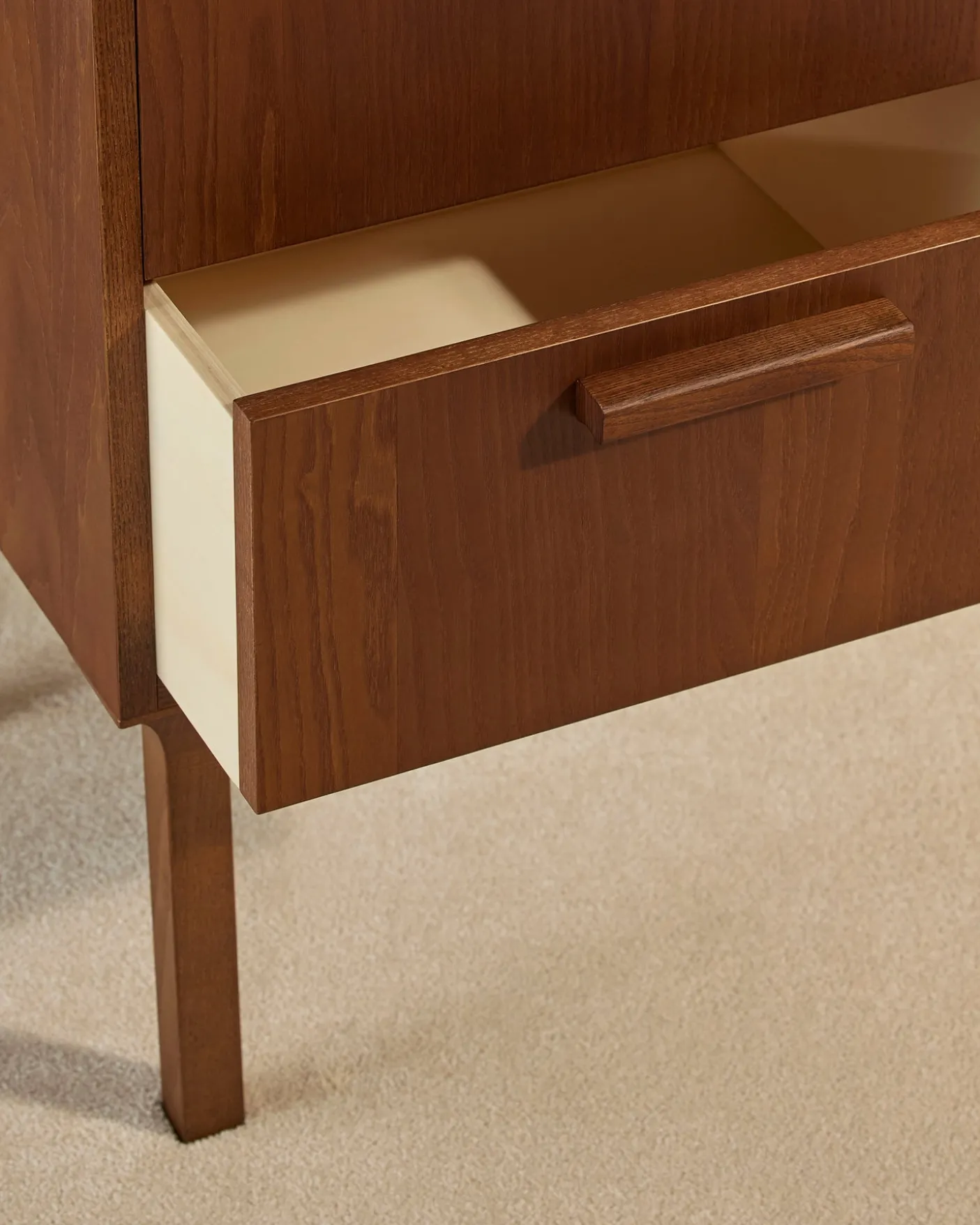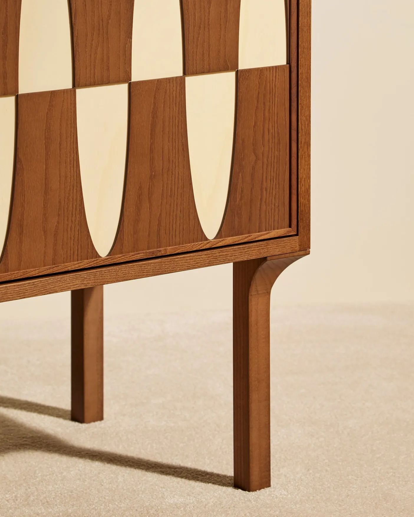 Fabriquée dans un atelier espagnol, l’enfilade Écailles présente deux teintes de bois et une finition noyer.