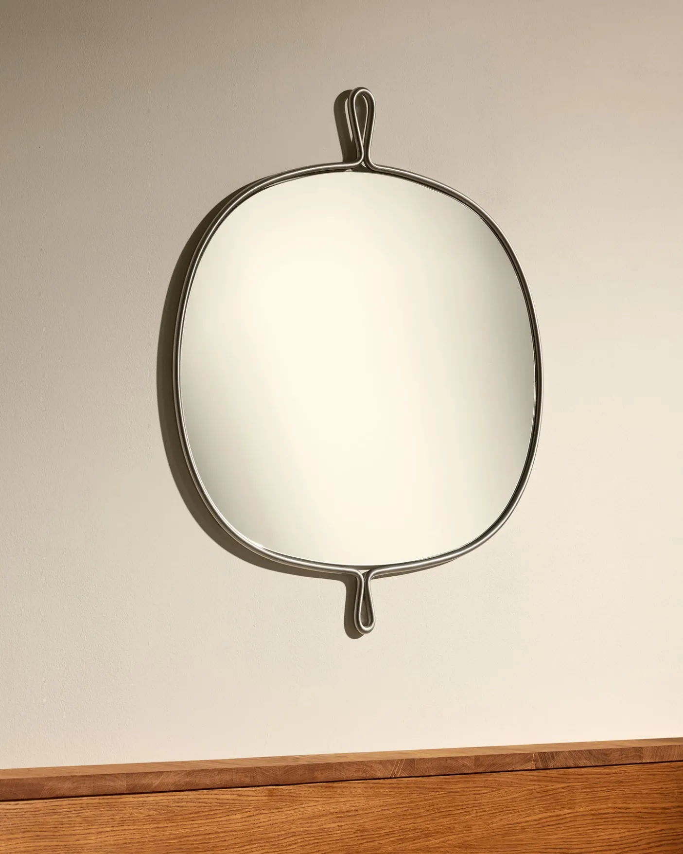 Ce miroir en métal torsadé est proposé en deux formats et deux matériaux teintés, inox noirci verni ou inox brossé.