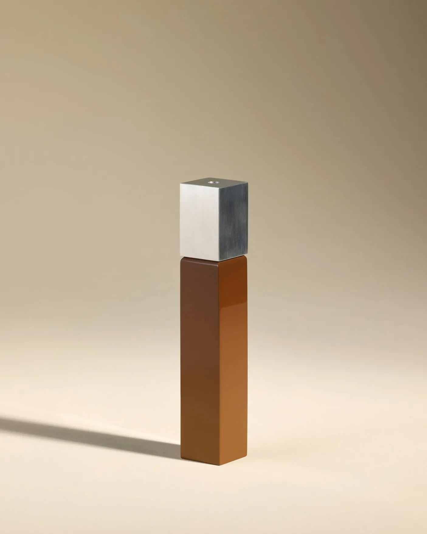 Cubique, avec doux détails biseautés, coque argentée contrastant avec la couleur vibrante de son contenant, ce bel objet joue sur la subtilité. Laqué en dégradé selon un savoir-faire artisanal, le voilà qui s’affiche sous son plus beau jour : une stature qui attire les regards sur une table de salle à manger ou un guéridon d’entrée.