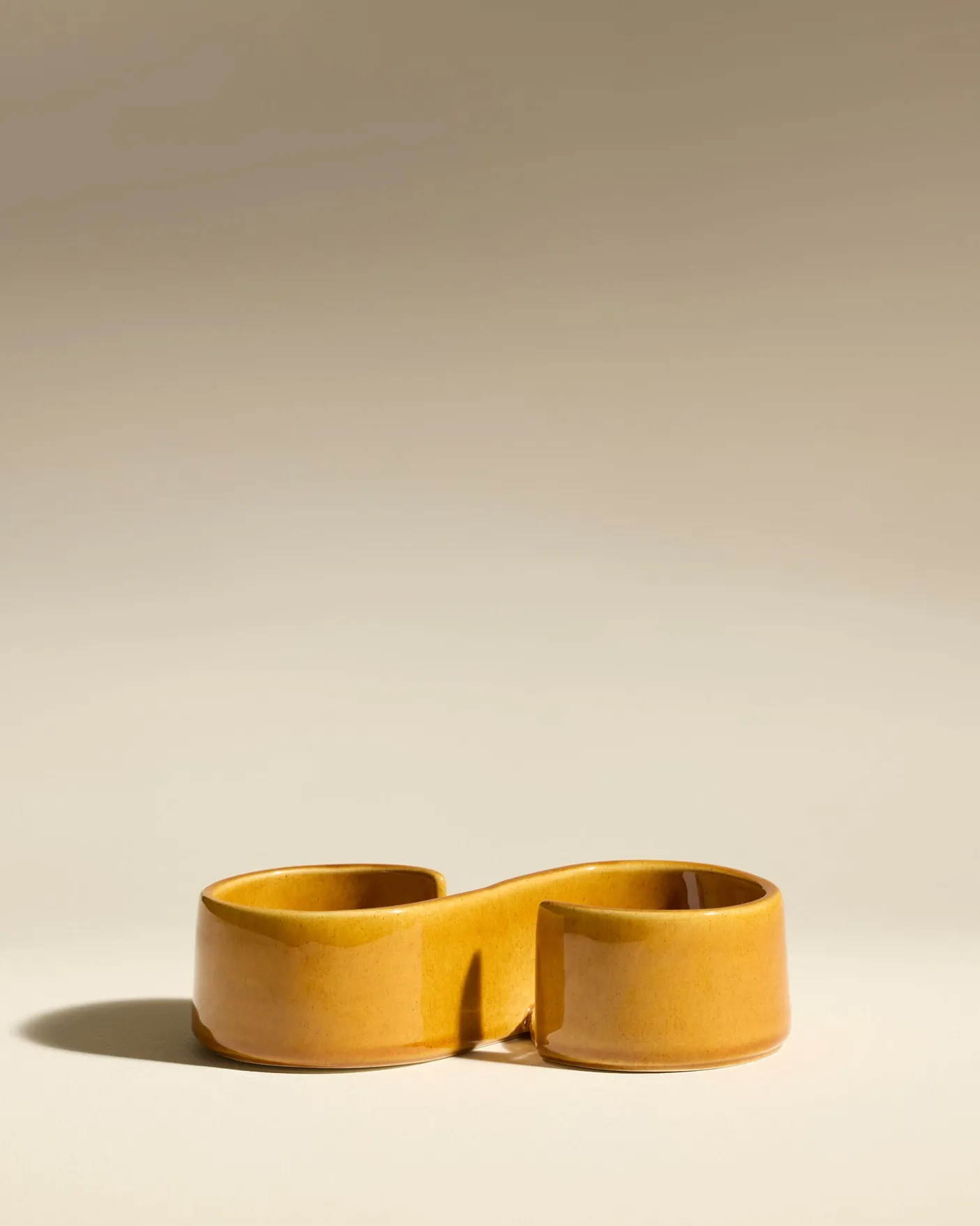 Lovées dans ce contenant à la forme serpentine, les deux bougies cylindriques dialoguent en toute intimité, installant une atmosphère délicate et raffinée.