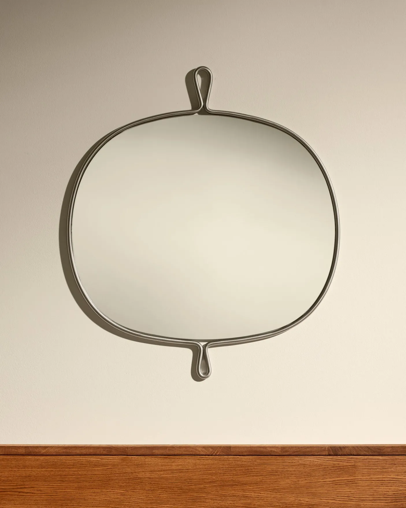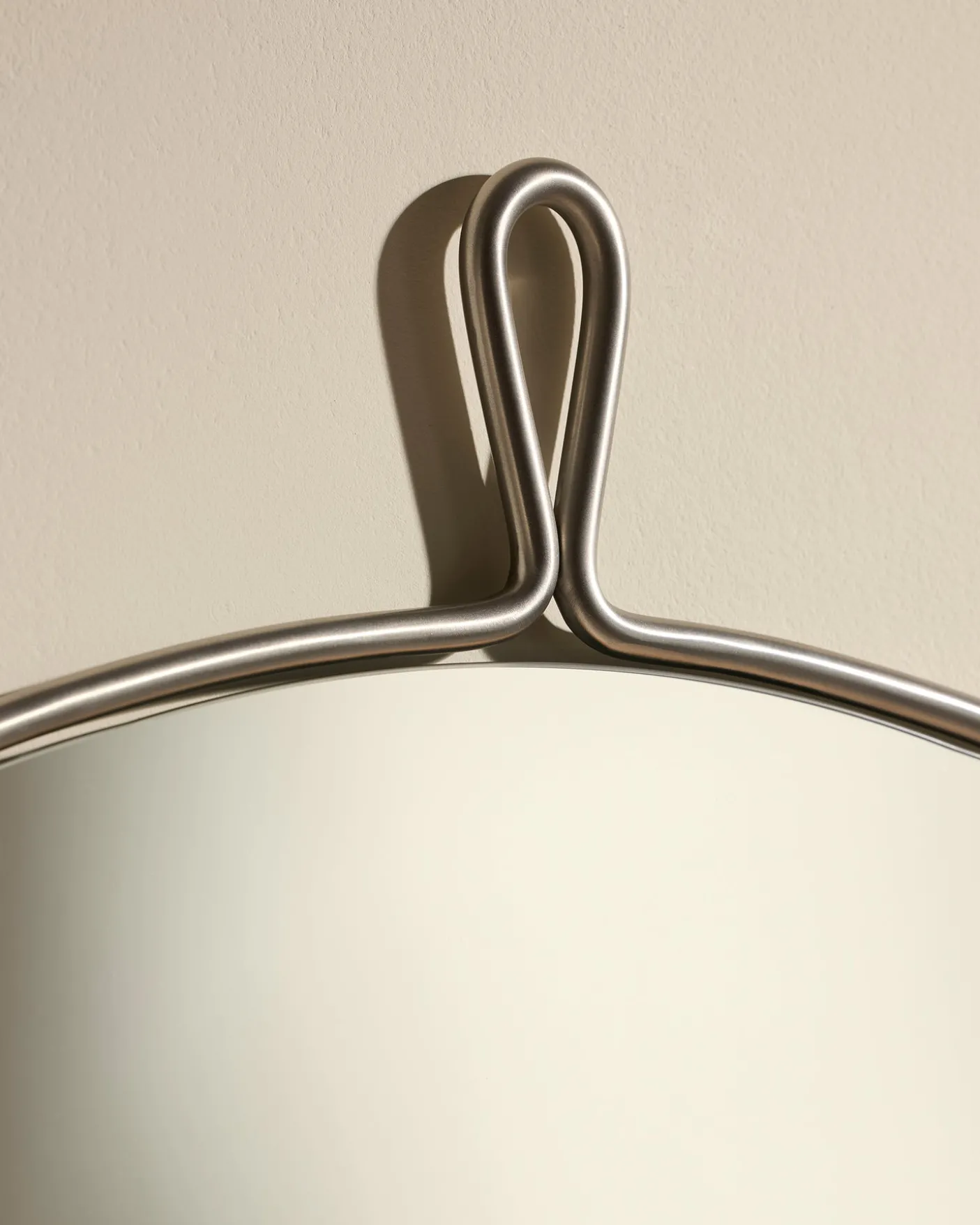 Ce miroir en métal torsadé est proposé en deux formats et deux matériaux teintés, inox noirci verni ou inox brossé.