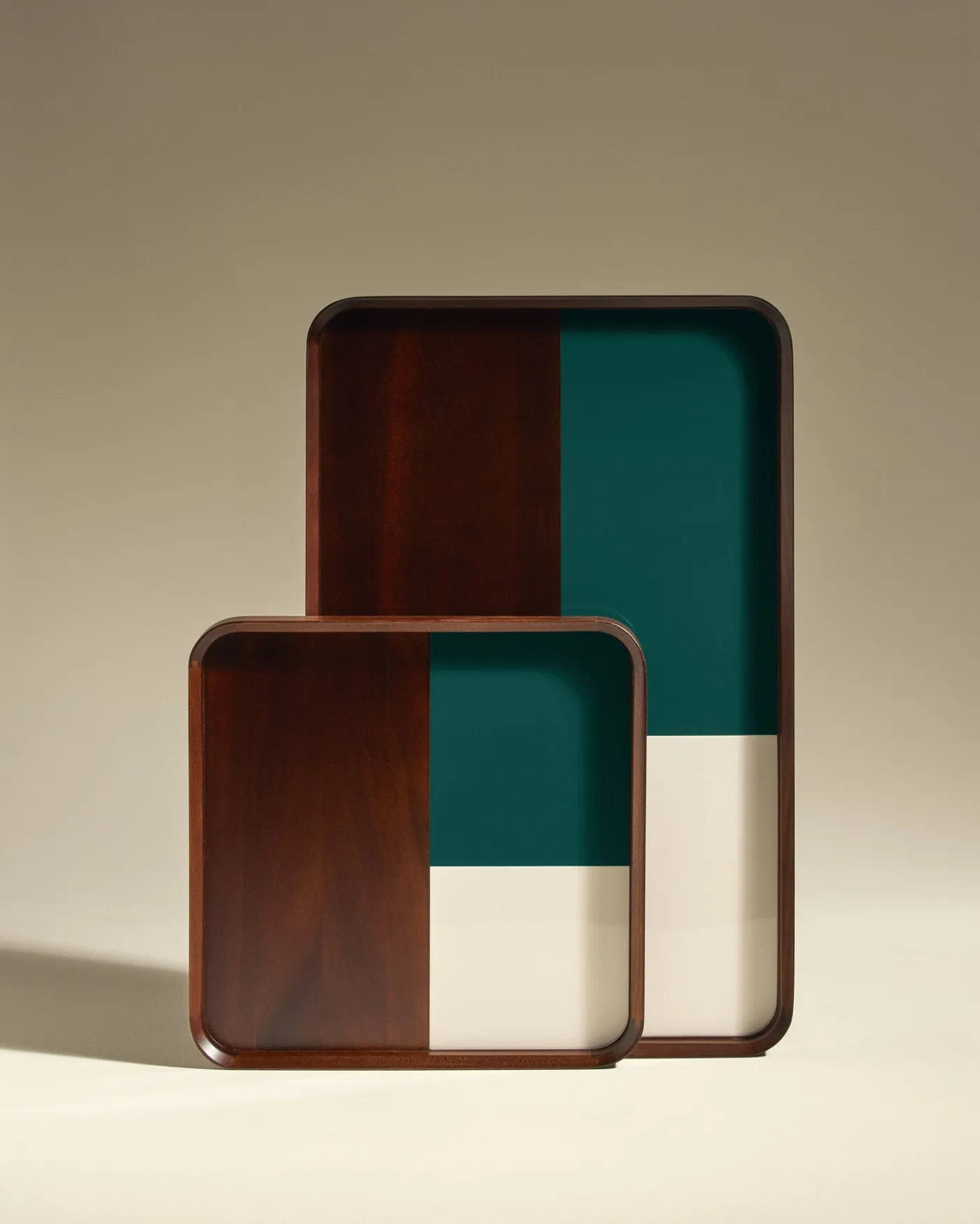 Conçu en bois exotique de freijo au Portugal, le plateau Sicilia a été travaillé à la main et à la machine pour l’assemblage des angles par tenon-mortaise.
